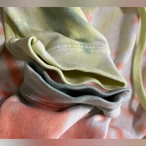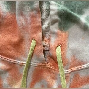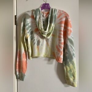Bright tie-dye hoodie with a cropped fit. Features a mix of orange, green, and yellow. Ideal for casual wear. Smoke free, pet free home.