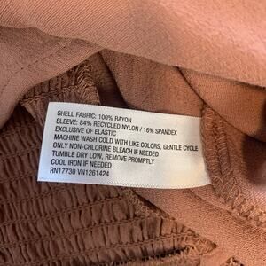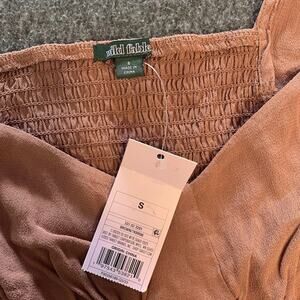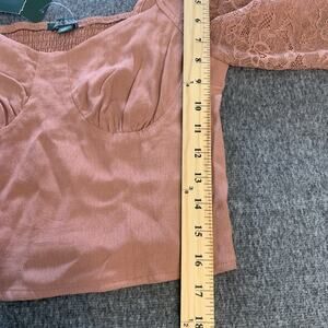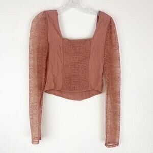 This is a Wild Fable Women's Juniors Cropped Lace Sleeve Blouse in size Small. The blouse features a romantic and coquettish style It has a classic/fitted lace sleeve design and comes in a brown color. This trendy top is perfect for adding a touch of femininity and sophistication to any outfit.