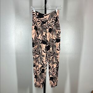 These ankle pants feature a striking tropical print with large beige leaf patterns against a black background. Made from lightweight fabric, they offer a relaxed fit and wide-leg design, perfect for warm weather outings. The bold print adds a vibrant touch to any casual ensemble.