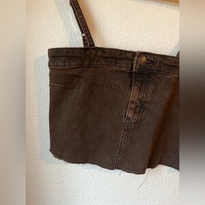 An up cycled look. Denim crop top with a denim pant look. Functional zipper button front. Reinforced raw hem line. Adjustable straps. Great for festival wear. Unique.