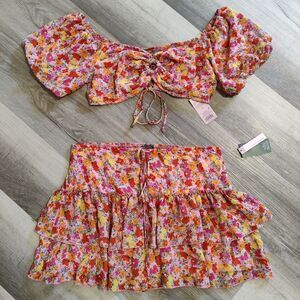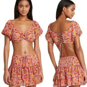 Bright floral crop top with lace-up back. Matching tiered skirt. Perfect for warm weather.