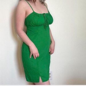 Wild Fable Green linen mini dress in green. Features adjustable spaghetti straps, ruched bust with tie detail, and front slits for a comfy fit and easy movement.
