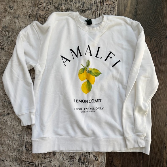 White sweatshirt with 'Amalfi' text and lemon graphic. Comfortable and stylish.
