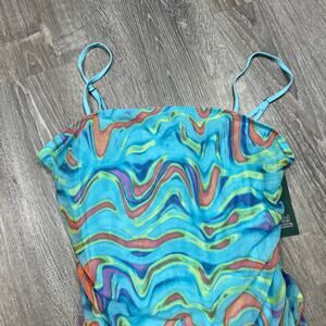 Brand new Wild Fable women's aqua blue wave ruched mesh below the knee dress with lining, adjustable straps and zippered back - size medium.