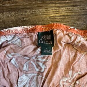 This vibrant sundress by Wild Fable showcases a lively orange hue adorned with delicate white floral patterns, ideal for resort wear. The sleeveless design features spaghetti straps and a fitted bodice that gracefully transitions into a flared mini skirt, offering a breezy and stylish look for warm days.