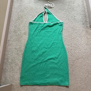 green, halter neck, ribbed, mini dress, piping, resort style, bodycon, summer dress, sleeveless, casual