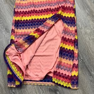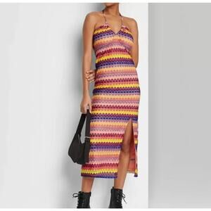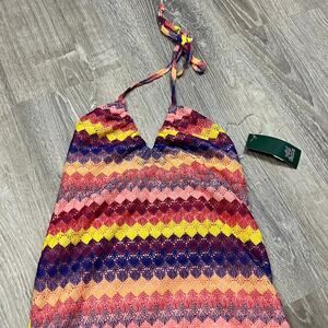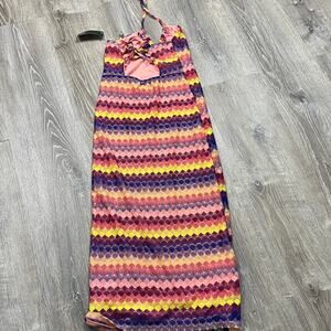 Add a pop of color to your wardrobe with this brand new Wild Fable slip dress! This eye-catching dress features a vibrant striped multicolor crochet design, perfect for making a statement. It's fully lined for comfort and has a stylish side slit, adding a touch of elegance. The tie at the neck and back allows for an adjustable and flattering fit. This dress is a must-have for any fashion-forward individual. Grab it before it's gone!