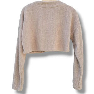 Elevate your wardrobe with this trendy Wild Fable Women's Cropped Sherpa button-up top, available in various sizes. The top features a V-neckline, long sleeves, and a button closure. The solid pattern, beige color, and casual sleeve type make it versatile for any occasion, be it casual or travel.