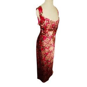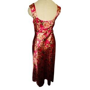 Romantic rose print satin midi dress by Wild Fable. Features a vibrant pink base with allover rose floral pattern, sleeveless cut, and a flattering fitted waistline. Perfect for date nights, garden parties, or layering with a jacket for a chic streetwear vibe.