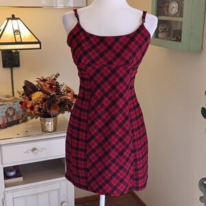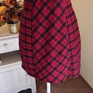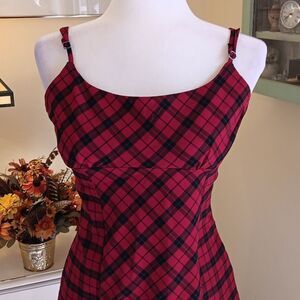 This cutie is versatile and fun. Wear as-is or add a Tee. Gathered under chest, adjustable straps, back zip, back elastic. Stretchy fabric. Size M measures 36 at chest, 30 under chest, 36 at hips, 31 long from shoulder to hem. Stylish red and black plaid dress. Perfect for casual wear.