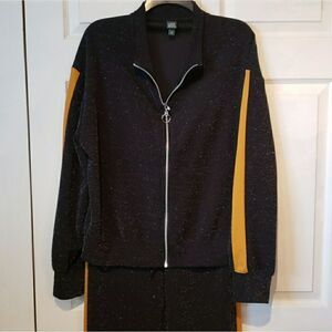 Jumpsuit Top = XXL Size, shimmery black with mustard yellow strip on sleeves, zips up frontside, 24" chestline measurement