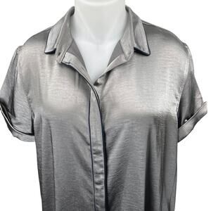 Wild Fang Gray Silver Metallic Silk Satin Short Sleeve Collared Button Down Midi Shirt Dress Size L