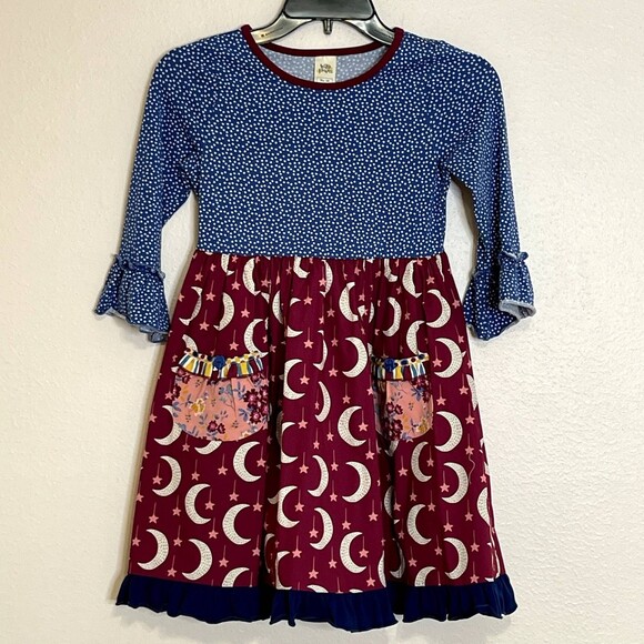Pre-owned dress but in EUC, no flaws found, like new. Super cute and fun floral pockets and moons and stars novelty print, mixed media.
