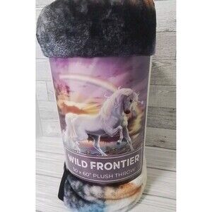 This Wild Frontier Unicorn Plush Throw is a must-have for any unicorn lover. Measuring 50\"x60\", it's the perfect size to use as a decorative throw or for snuggling up on the couch. Made of soft and durable polyester material, this throw is machine washable and tumble dryable for easy care. The multicolored unicorn design is perfect for adding a touch of fantasy and magic to any room. Whether you're looking for a cozy addition to your bedding collection or a fun piece of decor for your living room, this unicorn throw is sure to impress.