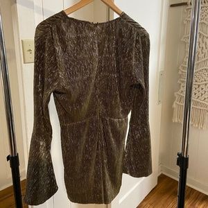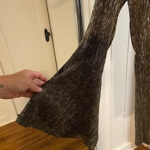 Wild Ginger Jumpsuit/ Romper with deep tie in front and bell sleeves.
