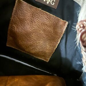 made of calf hair with a patterned strap and fringe detailing. a "CowHide and Leather Women's Tote Bag made by Wild Goose company", it looks new without tags aprox size 12 x 17