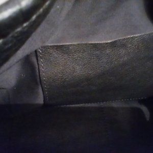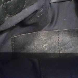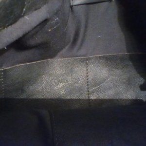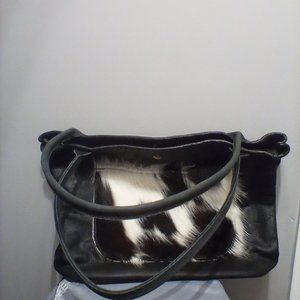 All black genuine leather purse/tote with a black and white cowhide pocket in the front with two long leather handles and it has a button closure. It has one pocket inside and 2 on the opposite side on the inside of this tote. Never been used before.