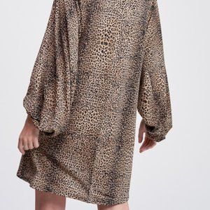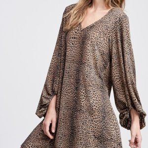 A long sleeve cheetah print knit dress with a V-neck featuring puff sleeves and a loose fit. Fabric is soft and drapes well.