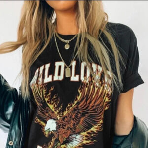 Short sleeve crew neck eagle tee. Relaxed fit. Size down if you’d like a more snug fit.
