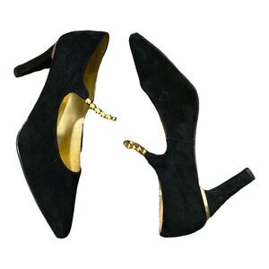 Wild Pair Black Suede Pointy Toe Pump Heels Gold Beaded Strap Size 10.