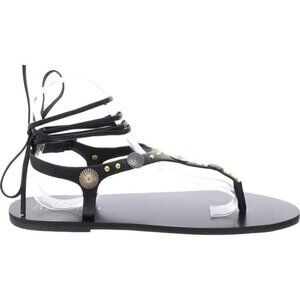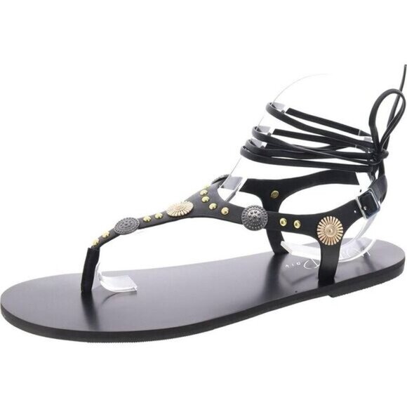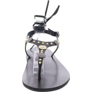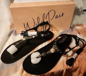 Step out in style with these black T-strap sandals from Wild Pair. The Earheart sandals feature gold accents and are new in box.