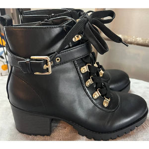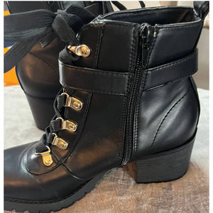 Keywords: ankle booties, lace up boots, black boots, gold hardware, buckle detail, block heel, womens boots, fashion boots, casual boots, dressy boots, fall boots, winter boots, stylish boots
