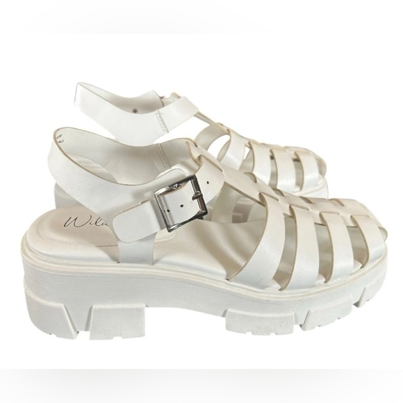 Stylish white sandals with a chunky sole. Features strappy design and adjustable buckle. Ideal for casual outings.