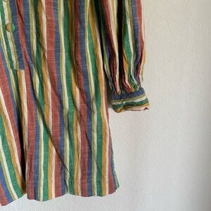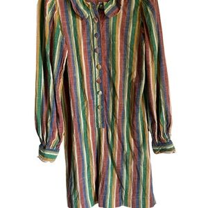 Vibrant multicolor striped dress with long sleeves. Features a button-up front and a stylish collar.