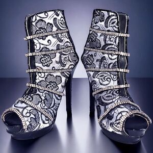 Wild ROSE black white floral Tapestry Rhinestone ankle boots stilletos