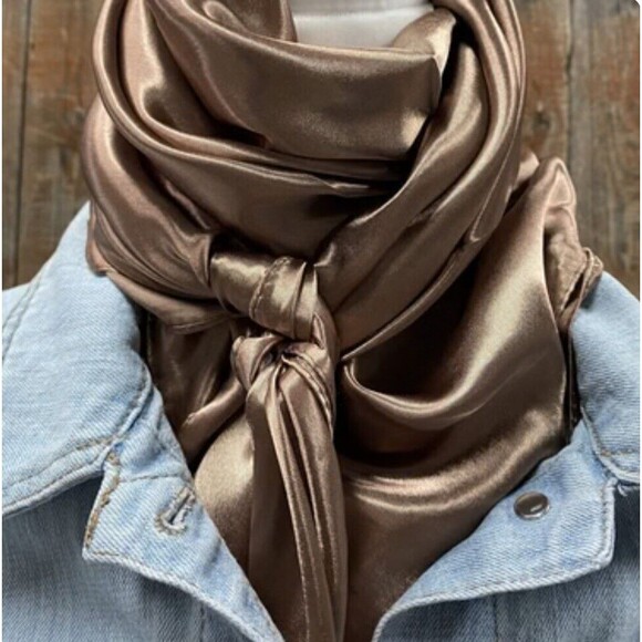 This Wild Rag Scarf is a versatile accessory for women with a Western cowgirl style. The scarf is a solid tan color, made of satin fabric in a square shape measuring 35" x 35". It can be worn in various ways and is a perfect addition to complete a Western-themed outfit.