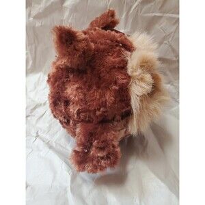 This is a small (8 inches) Wild Republic Fuzzballs Owl plush toy in a round shape. It features big sparkly eyes and is brown in color. The toy is new with tags and has a vintage style.