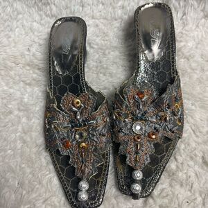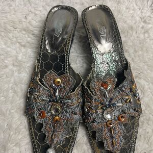 Wild Rose Gray chiffon fabric Sandals orange embroidery & beads accents SZ8.5.Pre owned in good used condition normal wear see all pictures any questions please message.G4