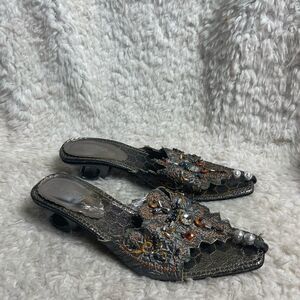 Wild Rose Gray chiffon fabric Sandals orange embroidery & beads accents SZ8.5
