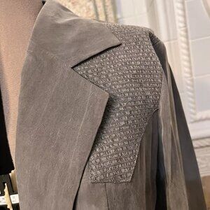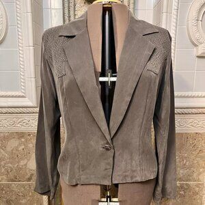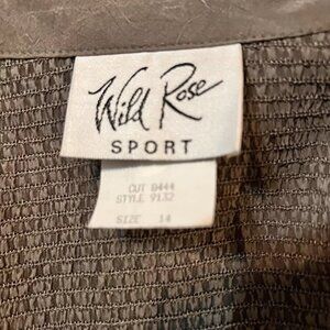 Wild Rose. Sz 14. Lightweight Rayon Suede Cloth Jacket. Embroidered Contrast. Shoulder to hem 24". Sleeve 24". Bust 22/44". Dry clean. Mexico. Unlined. Shoulder pads - easily removed. Soft.