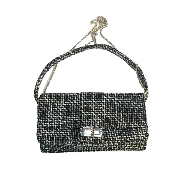 Wild Rose Tweed Handbag Black White Top Handle Removeable Silver Crossbody Chain