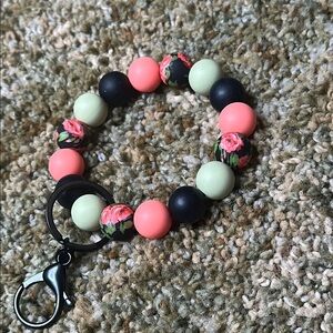 Stylish keychain bracelet with wildflower designs and solid silicone beads. Features cream, taupe, green, and wildflower floral beads. Perfect for adding a touch of elegance to your keys.
