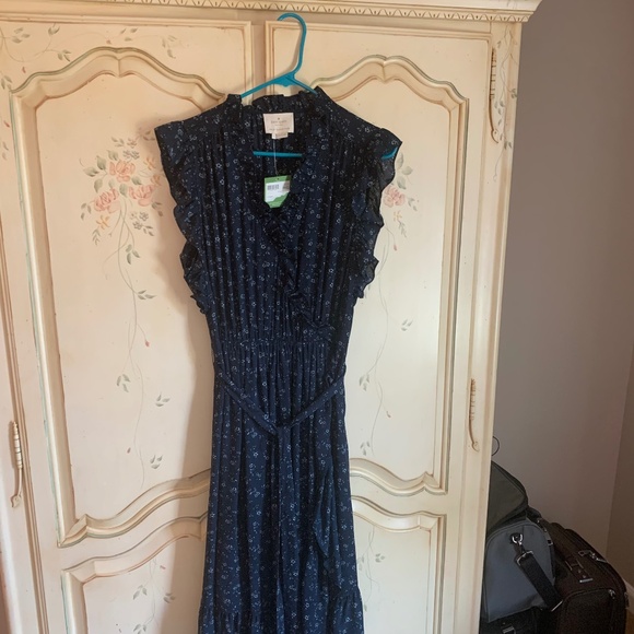 This elegant navy blue dress features a charming floral print, perfect for any casual or semi-formal occasion. The sleeveless design is accentuated with delicate ruffles along the shoulders. The dress has a flattering V-neckline and a cinched waist that is enhanced with a matching fabric belt, creating a graceful silhouette. The skirt flows into a gentle A-line shape. Made from lightweight, breathable fabric, this dress ensures you stay cool and stylish.
