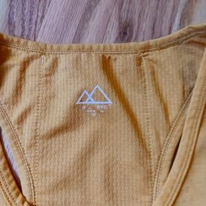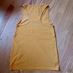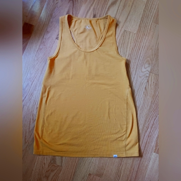 Wild Rye women's Mia racerback tank top. Wool blend (see tag, 11% wool). Size 6. Nice golden yellow color. Geared towards cyclists so has a small pocket in upper back for a gel pack or something. Worn a handful of times. Pit to pit about 14.5 inches. Cut seems to be meant to be tight around bust, flowier below bust.