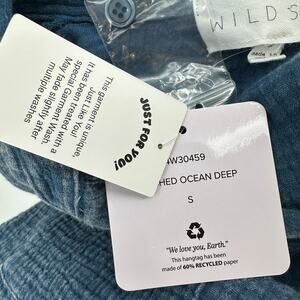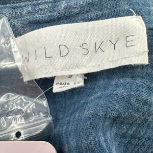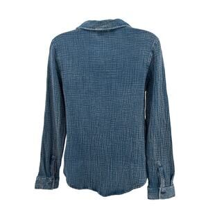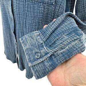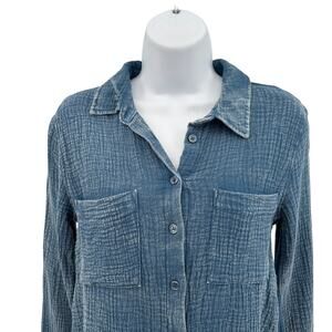 Wild Skye Raw Earth Button Up Shirt Top Women's Size Small, Vintage Wash Blue, Soft, Crinkle Cotton 100% (not traditional denim), Collared neckline, full button-front closure, two chest pockets, Long Sleeves with Button Cuffs, Style# 4W30459, features a relaxed fit and a textured, gauze-like fabric in a versatile blue hue. Perfect for Casual wear, relaxed, comfortable.