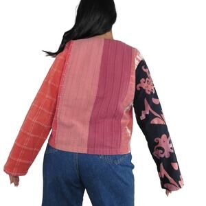 Wild Thing Wild Woman 1990s Vintage Pink Patchwork Jacket with Multiple Prints and Patterns. It's Giving Phoebe Buffay. Colorblock Style Exploded Patterns with Solid, Plaid, Geometric, and Floral Patterns. Obsessed with this Funky Casual Vintage Jacket