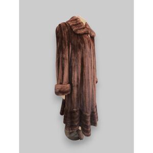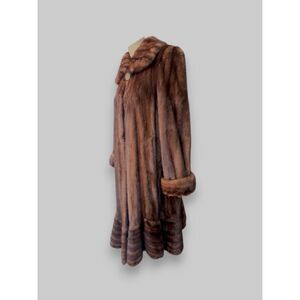 This is a fabulous full body vintage 80’s style coat made with exquisite mink fur. Comfortable large. It features a classic design, a spectacularly wide trumpet bottom, a cross-cut winged collar, shoulder pads, inside ties, straight back & front, and straight sleeves with roll up wrist cuffs. This vintage fur coat is in excellent condition and has been stored under ideal conditions in our cold fur storage vault. There are 3 hook & eye closures plus a large golden acrylic button at the top, and 2 pockets plus one hidden inside pocket. The paisley patterned silk-blend lining is in great condition with minimal signs of wear. There is a small monogram inside.