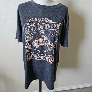 Embrace the spirit of the Wild West with this stylish t-shirt. Featuring a bold cowboy graphic, this gray shirt is perfecT. Comfortable and trendy, it's a great addition to any wardrobe.