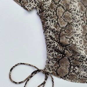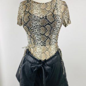 The Tan Snake Print Top Keep it stylish and flirty and the perfect fall essential that can be layered and worn under the perfect blazer or cardigan this fall/winter it also looks super rad with your vegan leather jacket! So many ways to wear this simple sexy top. I've paired this with super cute vegan leather shorts with tights underneath! The options are effortless.