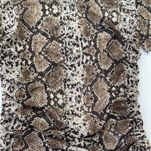 The Details: Sheer top, side ruched, short sleeve, cap sleeve, snake print, timeless top, sustainable essential, 93% Poly