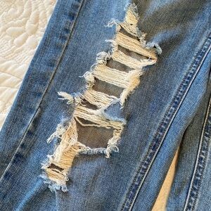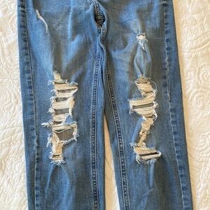 Wild fable high rise mom Jean in a faded wash with distressing and holes down the front legs. No distressing on the back.