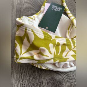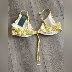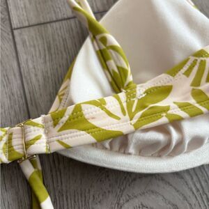 Stylish green floral bikini top with adjustable straps. Perfect for a beach day. Please note there are some stains found pictures attached
