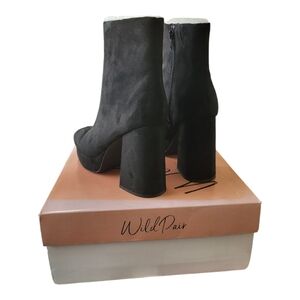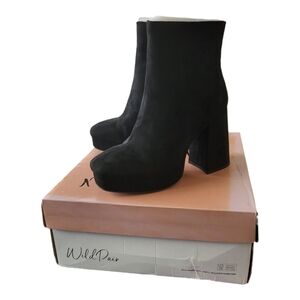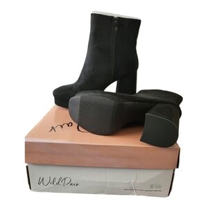 new in box. I love these. super cute. faux suede with zipper on inside of boot. nice black which will go with anything. dress them I p or wear with a pair of jeans. nice wide platform sole.