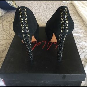 Beautiful addition to that little black dress. Black heel with gold assent on toe and heel. Worn Once comfortable platform.