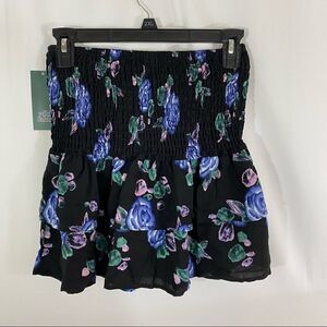 Black skirt with large blue flower prints. ruffles and smocked waist. Very stretchy