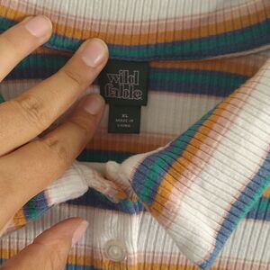 Details: Retro stripe polo style bodysuit with collar. Bodysuit has snaps. Stretchy and soft material.